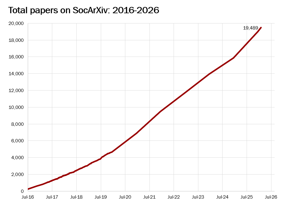 SocArXiv now hosts 17,000 papers across all disciplines in social sciences, arts, humanities, education, and law, in many languages. It is institutionally housed by the UMD libraries and operates on the Open Science Platform of the Center for Open Science.